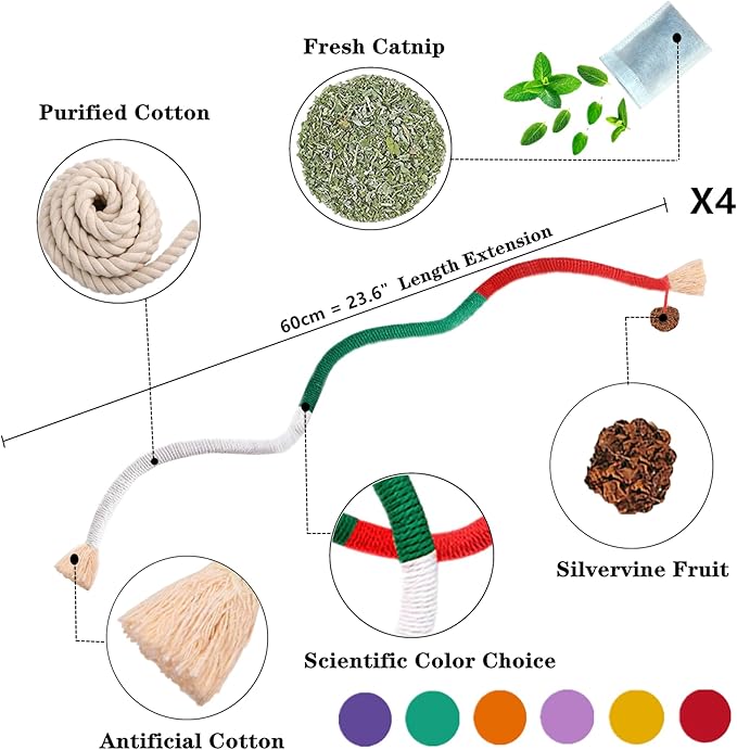 - 2.[Cat Chew Toy for Cleaning Teeth]:This catnip rope toys and silvervine stick are made of natural cotton rope. When cat scratching, chewing, grinding, biting, touching, kicking or hugging soft cotton rope of cat chew toy with catnip can effectively protect cat's dental gums health, clean teeth, improve digestion, prevents hairballs. Let your cat get gentle care of this cat toys for indoor cats suitable for self-playing or interactive.