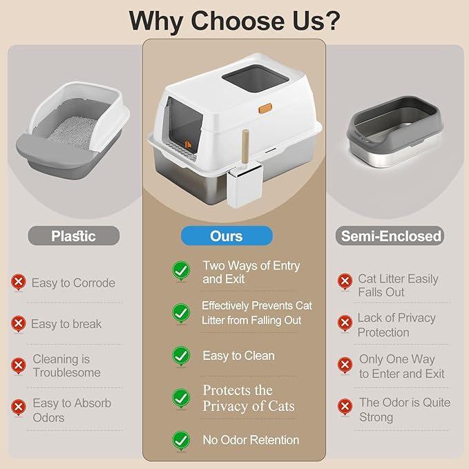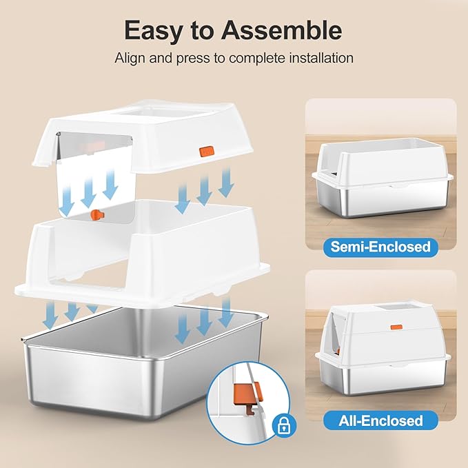 - 【Innovatively Designed Cat Litter Box Enclosure】Featuring an easy-to-assemble modular system, our stainless steel litter box offers both enclosed litter box and semi-enclosed configurations to suit various needs. The enclosed setup provides a private space for your cat, effectively keeping litter and odors contained, while the semi-enclosed option caters to cats preferring more open spaces and simplifies cleanup for owners