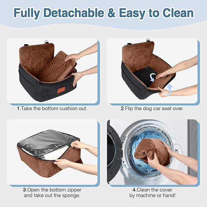 Dog Car Seat for Small Dogs Under 30lbs,Ultra Soft Fabric & Memory Foam Pet Travel Car Bed,Washable & Detachable,Anti-Slip Bottom,2 Storage Pockets and Safety Tethers(Black/Brown)