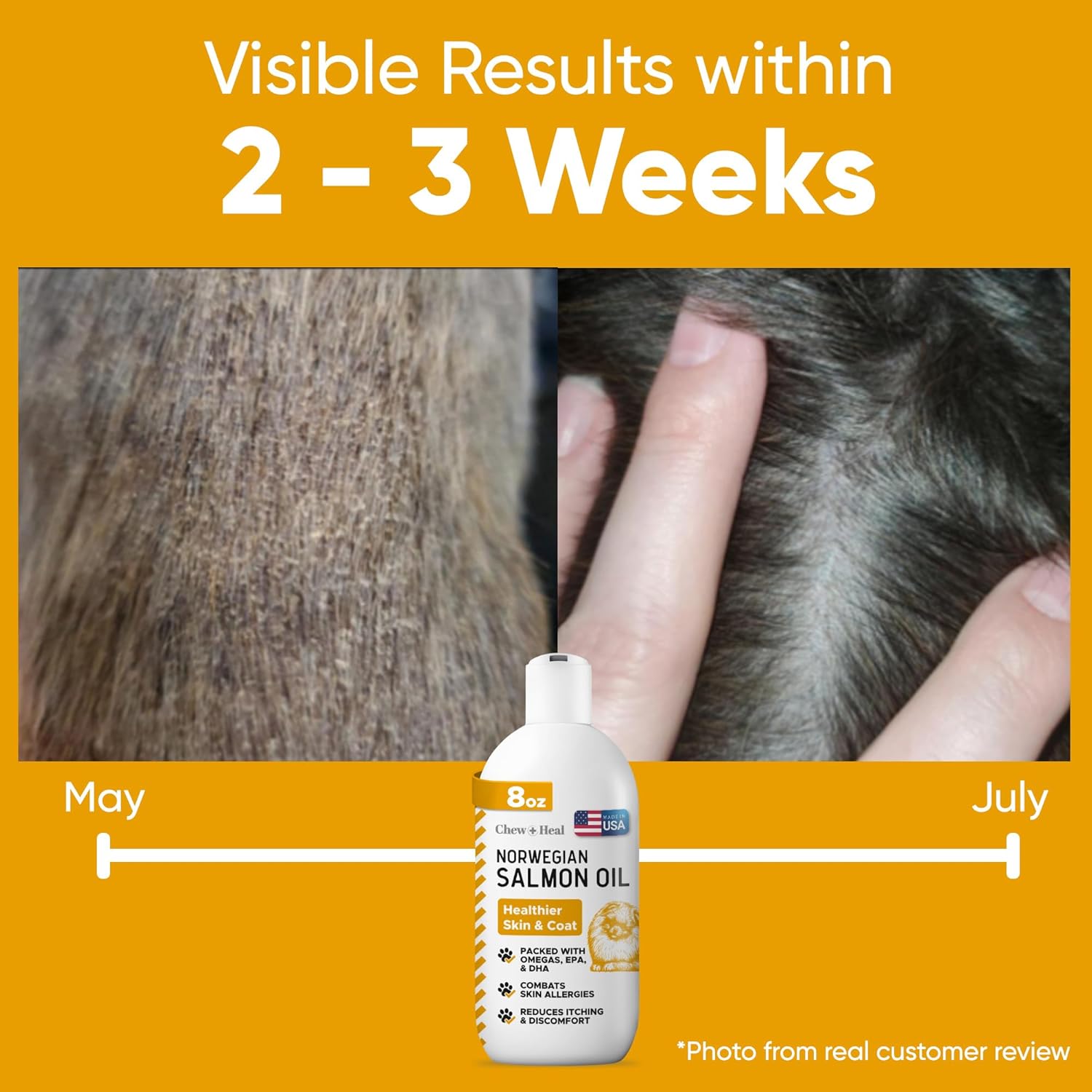 - Chew + Heal's Norwegian salmon oil for dog food is packed with omega-3 fatty acids to promote healthy and happy fur for your dog.