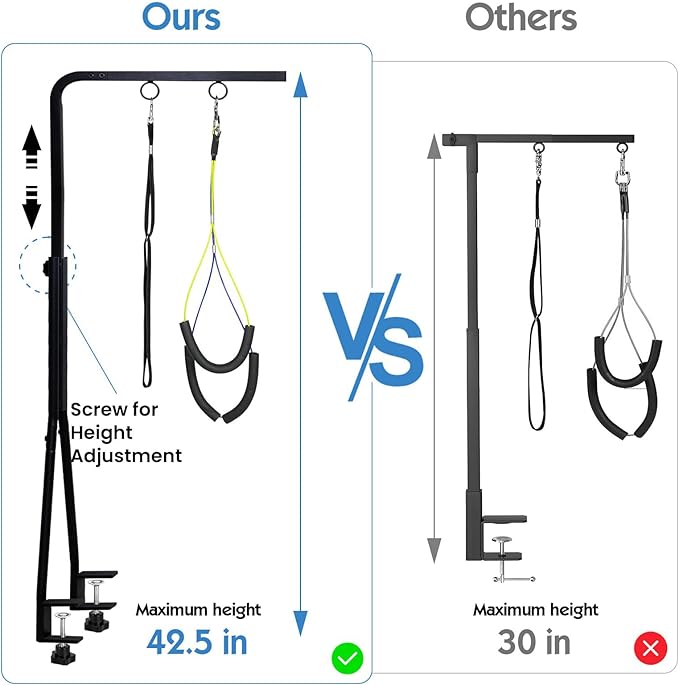 - [Adjustable Dog Grooming Arm with Double Clamp]: The maximum height of our dog grooming arm is approximately up to 42 inches and comes with sturdy double clamps which fit a tabletop of up to about 2.5 inches in thickness. This grooming arm is suitable for small and medium dogs, you can adjust the height according to the size of your dog, and providing a comfortable and convenient grooming position.