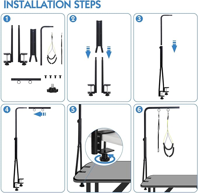 - [Package Content]: The product includes a grooming arm with double clamp, grooming loop, no-sit haunch holders, 4pcs screws.Grooming table not included. If you have any questions about our dog grooming arm, please feel free to contact us,we will respond and solve the problem for you ASAP.