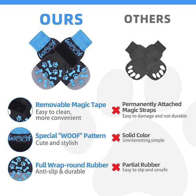 - DOUBLE SIDED NON-SLIP: Each side of the sock has the grip, which provides additional traction when your dog walks on a smooth floor. Even if the socks are twisted, they can still work. In addition, the design of the double-sided grip ensures a longer lifespan of the socks. When the grip on one side is worn and has no anti slip effect, it can cause the dog to wear on the other side, exerting a new anti slip effect.