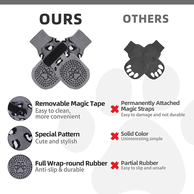 - DOUBLE SIDED NON-SLIP: Each side of the sock has the grip, which provides additional traction when your dog walks on a smooth floor. Even if the socks are twisted, they can still work. In addition, the design of the double-sided grip ensures a longer lifespan of the socks. When the grip on one side is worn and has no anti slip effect, it can cause the dog to wear on the other side, exerting a new anti slip effect.