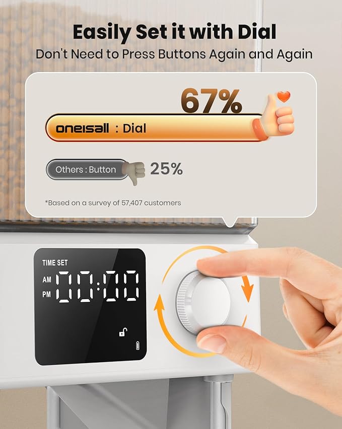 - Easy to Set Up: oneisall automatic cat food dispenser has a dial to simplify the programme. Everyone can easily set up it and control feeding