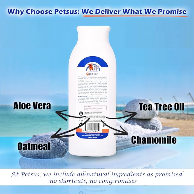 - Product Benefits : Gentle and Safe: Hypoallergenic and tear-free formula, perfect for pets with sensitive skin. Ensures a soothing, irritation-free bathing experience, making it ideal for regular use., Itch Relief: Provides targeted relief from itchy, irritated skin, helping to reduce scratching and discomfort. Great for pets prone to allergies or dryness., Natural and Non-Toxic: Crafted with natural ingredients, this shampoo is free from harmful chemicals such as parabens, alcohol, and artificial colors, ensuring safe and gentle care for your furry friends., Nourishing and Moisturizing: Enriched with Dead Sea Minerals and natural extracts like Chamomile, Oatmeal, Aloe Vera, and Tea Tree Oil, this shampoo deeply nourishes and hydrates your pet's skin and coat, promoting a healthy, shiny appearance., Odor Neutralizing: Effectively eliminates unpleasant odors, leaving your pet smelling fresh and clean for extended periods. A perfect choice for those seeking the best dog deodorizing shampoo., Soothing and Calming: Infused with calming Chamomile and Aloe Vera, it creates a relaxing grooming experience for pets while maintaining a balanced, healthy coat. Gentle and Safe: Hypoallergenic and tear-free formula, perfect for pets with sensitive skin. Ensures a soothing, irritation-free bathing experi… See more
