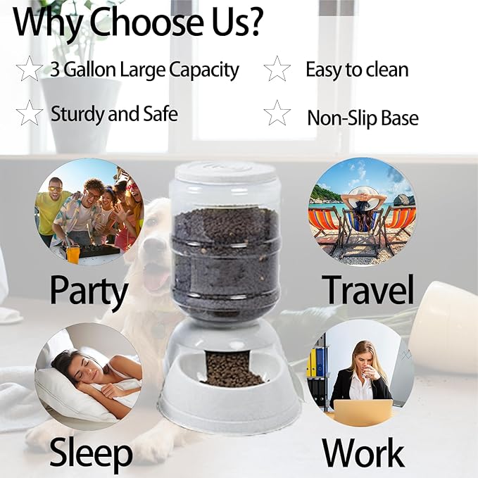 - 【Large Capacity Automatic Dog Feeder】: This gravity dog food dispenser has an upgraded capacity of 3 gallons and is specifically designed for large dogs. It can fill enough food for a large pet to last 6-15 days, providing continuous food supply for them throughout the day. Its large capacity allows for the storage of a large amount of food, reducing the need for frequent refills. It is more suitable for large pets and long-term travelers.