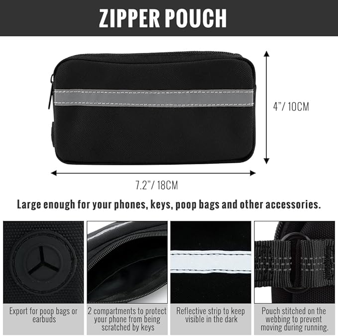 - 【Immovable Large Zipper Pouch】The walking dog leash comes with a large zipper pouch. The pouch is 7.2”*4”*1.2” in size, large enough to store most cellphones, keys, poop bags and other accessories. The pouch has 2 compartments to protect your phone from being scratched by keys. Unlike other running dog leashes that the pouch moves everywhere during running, our pouch is stitched to the waist belt so that it can stay still.
