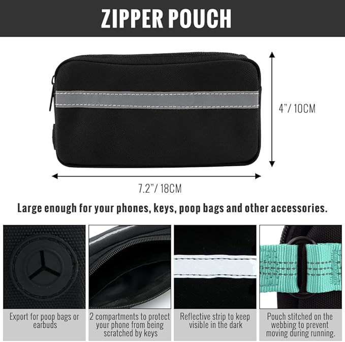 - 【Immovable Large Zipper Pouch】The walking dog leash comes with a large zipper pouch. The pouch is 7.2”*4”*1.2” in size, large enough to store most cellphones, keys, poop bags and other accessories. The pouch has 2 compartments to protect your phone from being scratched by keys. Unlike other running dog leashes that the pouch moves everywhere during running, our pouch is stitched to the waist belt so that it can stay still.