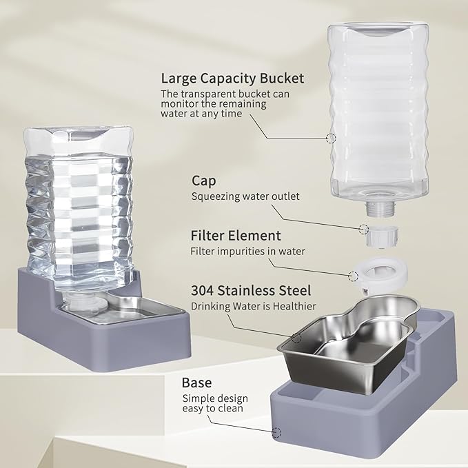 - [Excellent material] Automatic pet dispenser is made of high quality PP material, odorless, durable, safe for long-term pet use. The drinking bowl is made of high quality 304 stainless steel, durable, not easy to deformation, no rust, clean and hygienic, the transparent container design can help you know when you need to add water.