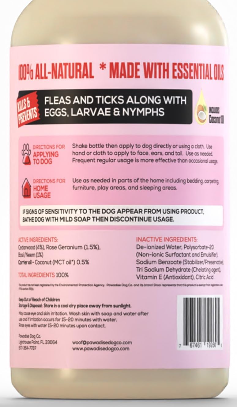 - NATURAL & CHEMICAL-FREE PROTECTION: Made with essential oils like cedarwood, rosemary, and eucalyptus with a touch of coconut oil to enhance the effectiveness, this spray is free from harsh chemicals, making it safe for daily use on your dog and around the home.