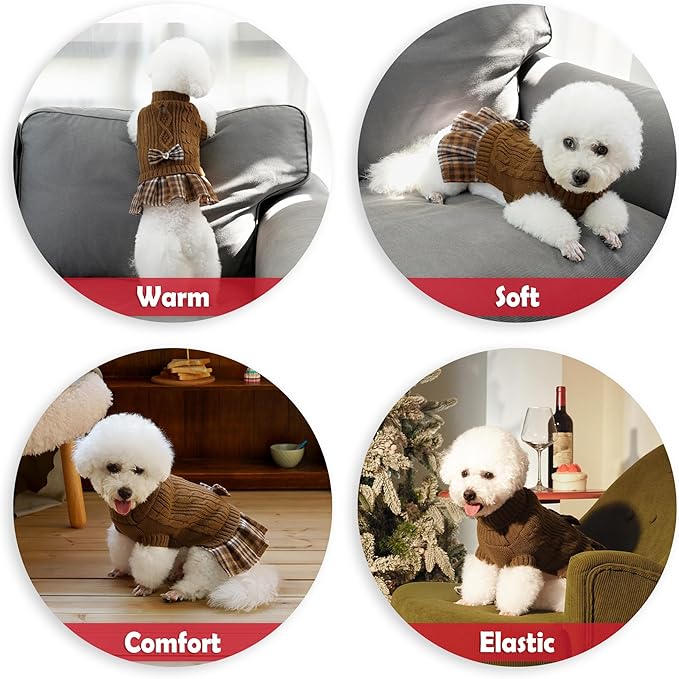 - Pleated Skirt Design: WOYYHO dog sweater with a plaid pleated skirt is basic but fashionable. Be ready for any occasion, daily activities, or taking photos at any time. A diamond-encrusted bow makes your furry friend look cuter