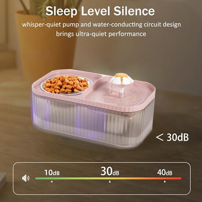 - 2 In 1 Cat Water fountain: Our 2-in-1 pet water fountain and food bowl features a unique and thoughtful design. It share the same base, but with isolation design to prevent food from entering the water fountain, avoiding dirty water or blocked water flow that may cause leakage. The 15-degree elevated design also reduces spinal pressure and makes feeding and drinking easier and healthier for your furry friend.