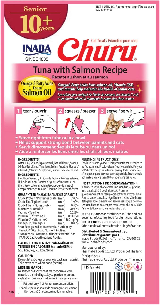 INABA Churu for Senior 10+, Creamy Lickable Cat Treats with Taurine, Vitamin E & C, 0.5 Ounces Each, 24 Tubes (4 per Pack), Tuna with Salmon Recipe