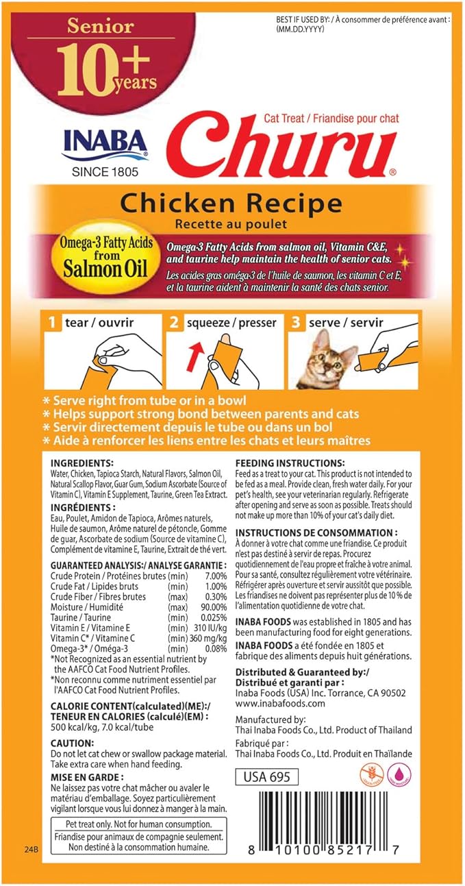 - SUPPORT HEALTHY AGING: Your feline friend is important to us, which is why Churu for Senior has added Omega-3 from salmon oil to support brain & cognitive function, Taurine for their overall health, and Vitamin E & C to help boost their immune system