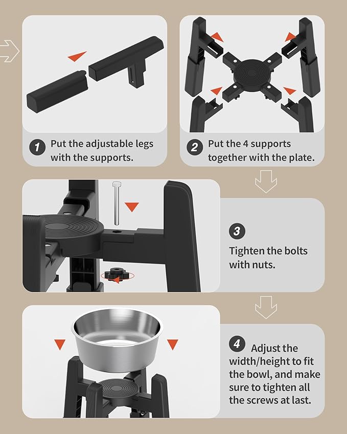 - [Easy Assemble and Use] You could assemble and adjust this CZPET raised bowl only by hand! Once you get the pet bowl stand, you just need to tighted the screws by hand. Then you will finish the assembly within 5 minutes. If you want to adjust it to fit different bowls, all you have to do is just loosen the screws by hand and then adjust freely.