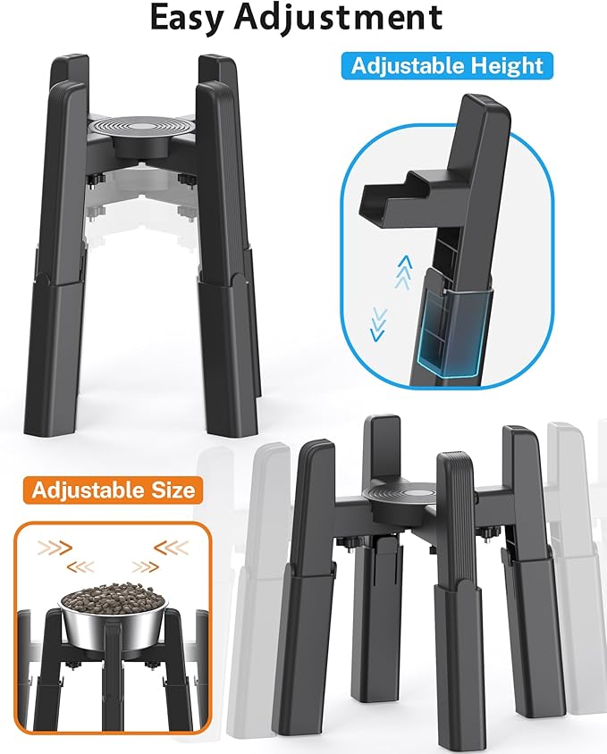 - [Adjustable Height & Width] Most of the stands on the market are only adjustable in height or width. But CZPET raised dog bowl has both adjustable height from 7.09 to 11.42 inches (with adjustable legs), and width 5.9 to 7.9 inches. And we have easy design for you to adjust conveniently. Just one CZPET stand is enough to accompany the growth of your dear pets.