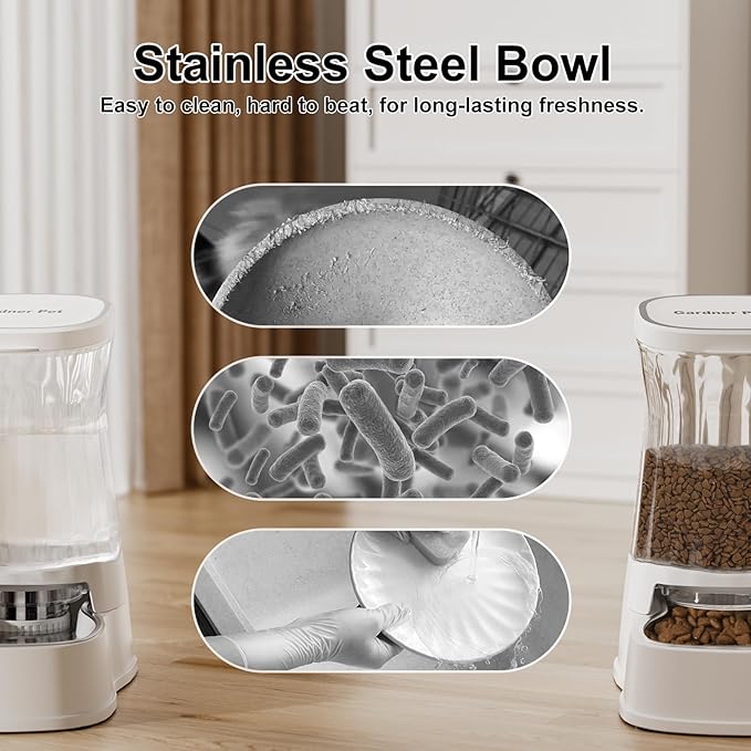 Automatic Pets Gravity Feeder and Water Dispenser Set, 1Gallon x 2 Stainless Steel Food Feeder and Waterer, 100% BPA-Free Water Bowl Dispenser for Small&Medium Dogs, Cats, Puppies(White)
