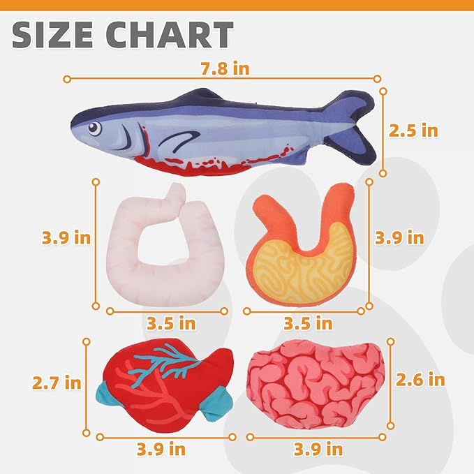 - 5 PACK CATNIP TOYS IN ONE PACKAGE: You will receive an exquisite packaging containing a cute fish (7.8 inches in length and 2.6 inches in width), as well as four fish organs including the large intestine, stomach, heart, and brain. It is colorful and suitable for Halloween atmosphere, making it the perfect gift for cute cats.