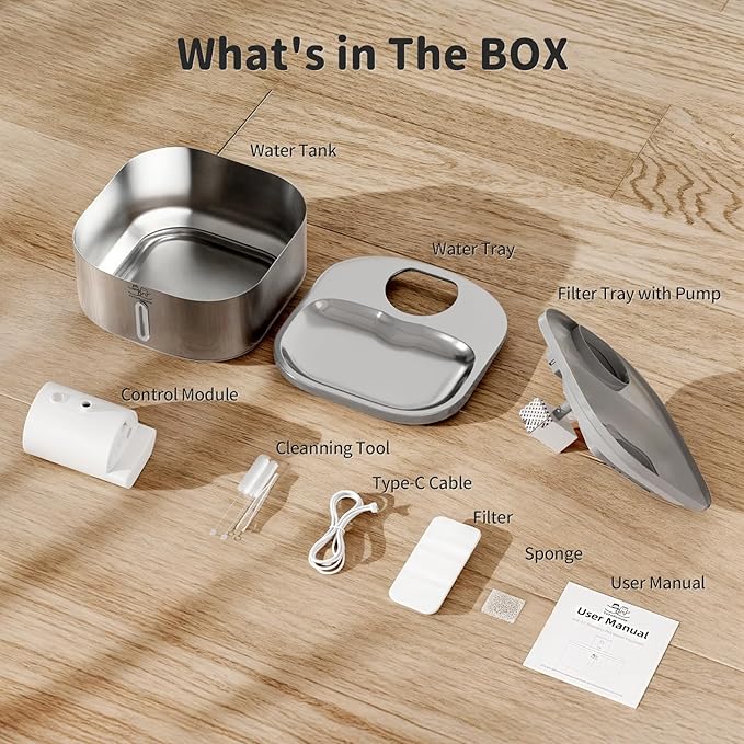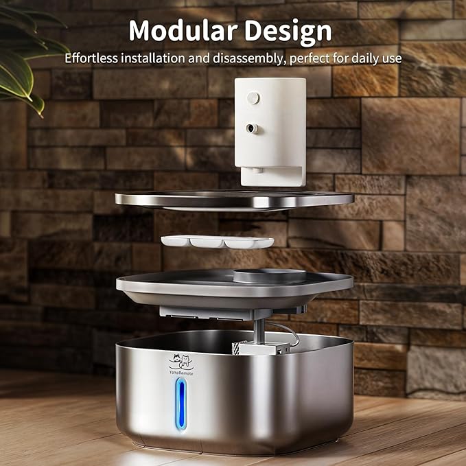 - Effortless Hygiene & Premium 304 Stainless Steel: Keep water fresh and clean effortlessly. The entire fountain is made from 304 stainless steel, which is easy to clean and dishwasher safe. The smart modular design features a quick-detach battery, making disassembly, cleaning, and reassembly incredibly simple. Spend less time scrubbing, more time cuddling.