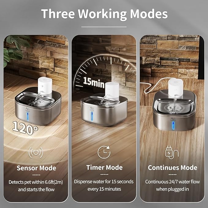 - 3 Modes for Every Pet's Preference: Tailor hydration to your pet's habits. Choose from three intelligent modes: Sensor Mode (dispenses water when your pet approaches), Timer Mode (schedules a flow every 15 minutes), and Continuous Flow Mode (requires plugging in). Perfect for curious kittens, scheduled drinkers, or multi-pet households.