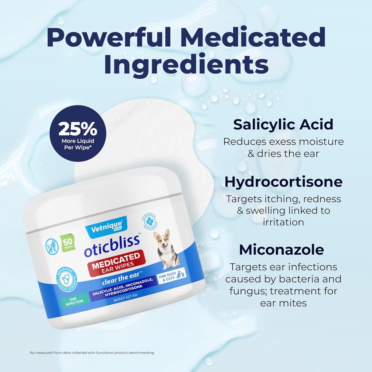 Vetnique Oticbliss Medicated Ear Wipes – Cat & Dog Ear Wipes with Hydrocortisone & Salicylic Acid for Cleaning & Odor Control – 50ct