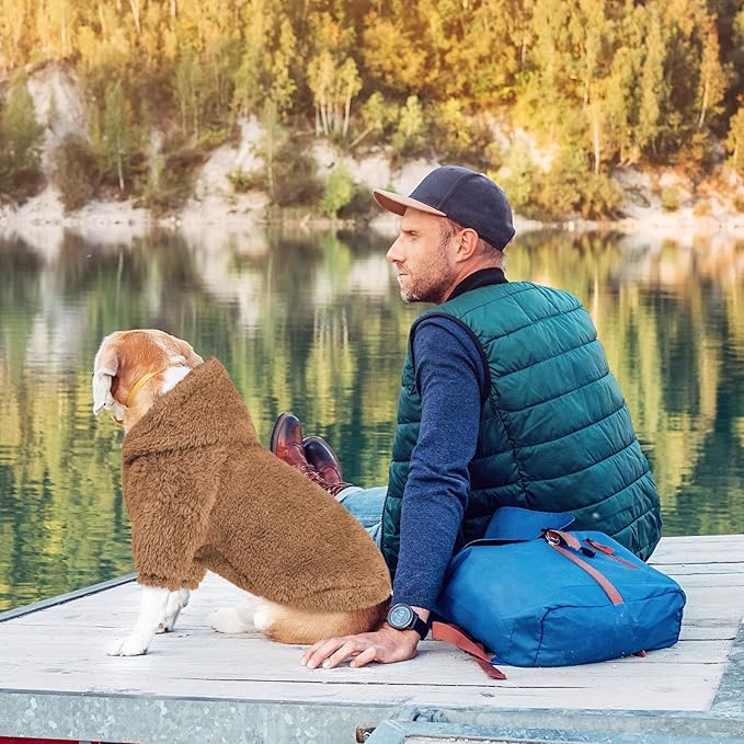 Fuzzy Dog Hoodie Dog Sweaters for Large Dogs Soft Double-Sided Plush Fleece Pet Sweater Pet Clothes Coats Hoodie Sherpa Hooded Sweatshirt(Coffee-L)