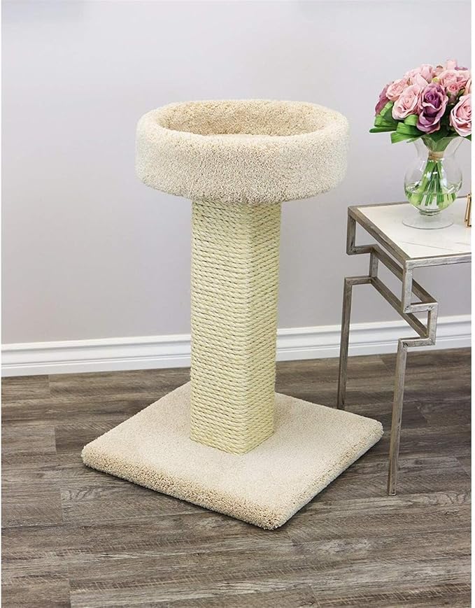 French Flair Elevated Cat Scratch Post with Cat Bed, Compact and Stylish Elevated Cat Bed with Plush Carpet and Sisal Scratching Post, Perfect for Sleep and Play Light Tan