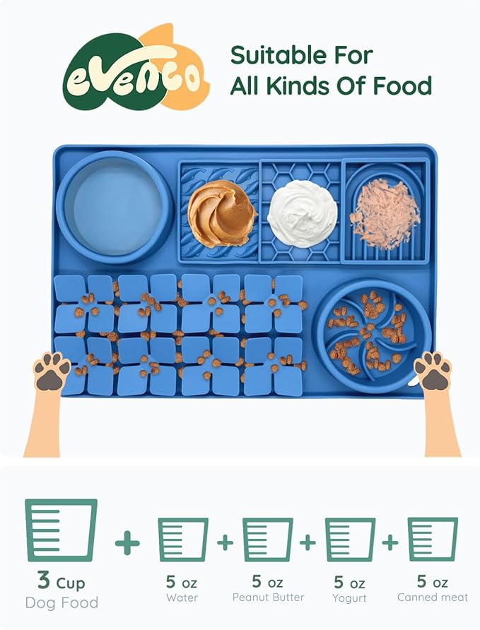 - UPGRADED 4-IN-1 FEEDER: Our multifunctional slow feeder dog bowls includes a slow-eating bowl, a water bowl, a snuffle area, and a 3-pattern lick area. Designed to cater to all your pet's needs in one innovative solution, it accommodates different food types and is ideal for most dogs' daily eating and play activities.