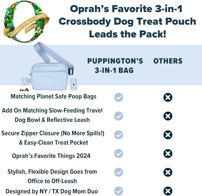 - OPRAH'S FAVORITE THINGS 2024: Discover hands-free convenience & effortless organization to help you keep your pup calm and focused while using your dog treat pouch. Integrated easy-clean treat pocket for easy rewards & training sessions with treat pouches for pet training. Discrete yet easy-to-access poop bag dispenser in the dog walking bag, with a roll of matching bags in a dedicated inner poop bag pocket. No more treats spilling from your dog walking fanny pack!