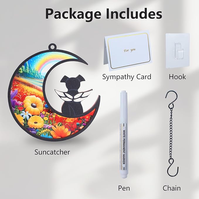 - What’s Included: --1 Suncatcher,1 chain,1 hook,1 pen,1 card (with rainbow bridge poem for loss of dog) 《Sealing Label Pattern Random》