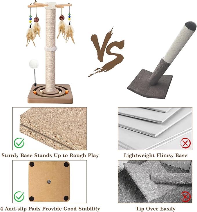 - STURDY BASE NOT EASY TO SHAKE: The cat scratcher post is made of sturdy, thickened paper tube and wrapped in natural sisal, with a base made of sturdy, high-quality wood.The 1.2-inch thickened square base prevents the post from wobbling or toppling over during vigorous play, providing greater reliability and stability.
