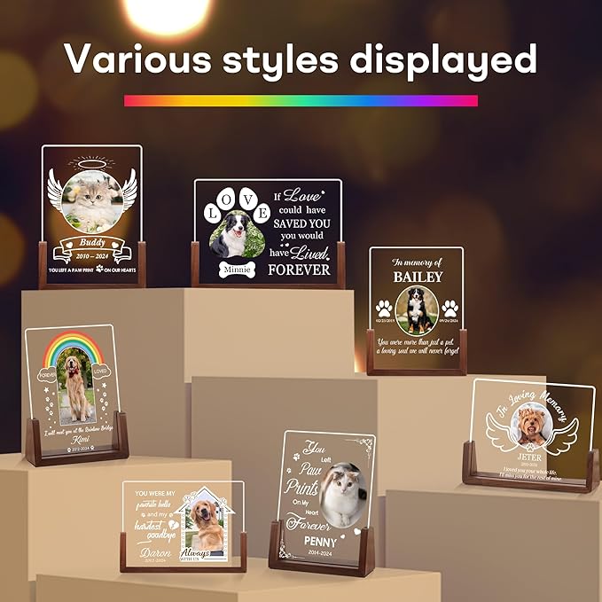 - How to Customize Dog Passed Away Gift: 1. Select the style you like and click "Customize Now". 2. Upload the pictures and text you need to customize 3. Select the size you need and submit the order. You can contact us for consultation at any time for other questions. Daily maintenance of the product: Just wipe the acrylic and base gently with a wet tissue.