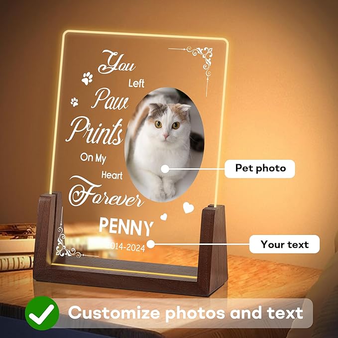 - Pet Loss Sympathy Gift High-quality Materials and HD Printing: The pet memorial night light is made of 5mm thickened transparent acrylic plate and a solid walnut base. The acrylic light plate uses UV high-definition printing technology, the content and texture are clearly visible, the color is bright, and it does not fade. The base uses a USB interface power cord and LED light display, which looks beautiful and elegant.