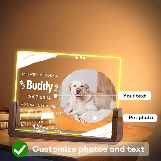 - Pet Loss Sympathy Gift High-quality Materials and HD Printing: The pet memorial night light is made of 5mm thickened transparent acrylic plate and a solid walnut base. The acrylic light plate uses UV high-definition printing technology, the content and texture are clearly visible, the color is bright, and it does not fade. The base uses a USB interface power cord and LED light display, which looks beautiful and elegant.