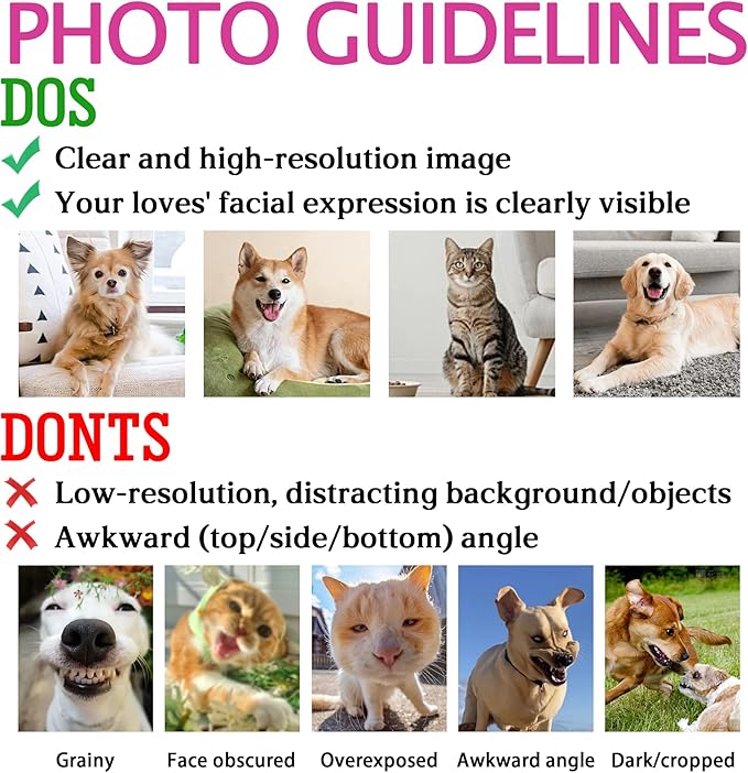 - How to Customize Dog Passed Away Gift: 1. Select the style you like and click "Customize Now". 2. Upload the pictures and text you need to customize 3. Select the size you need and submit the order. You can contact us for consultation at any time for other questions. Daily maintenance of the product: Just wipe the acrylic and base gently with a wet tissue.