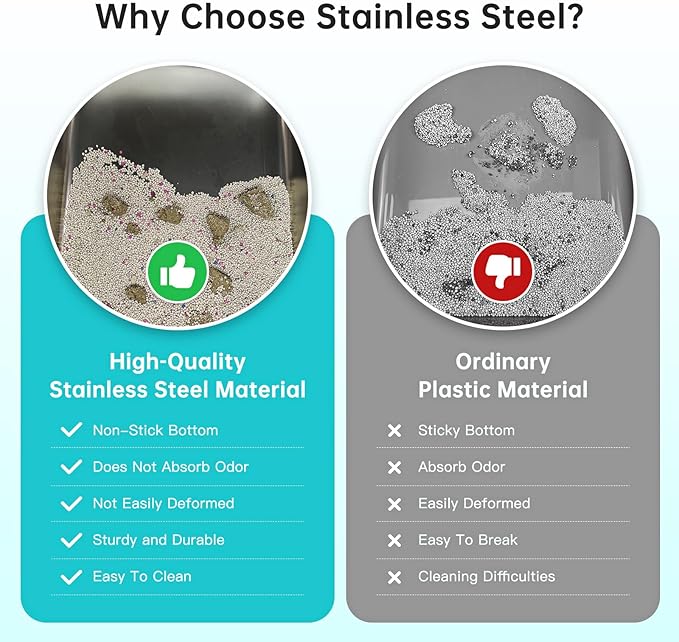 - [Why Choose Stainless Steel Litter Box!] Open top stainless steel cat litter box made of high-quality ABS enclosed high wall enclosure and stainless steel litter pan, unlike plastic litter boxes, stainless steel litter boxes with high sides do not collect any residue or odor, are easily to clean, have strong and durable, and never rusty