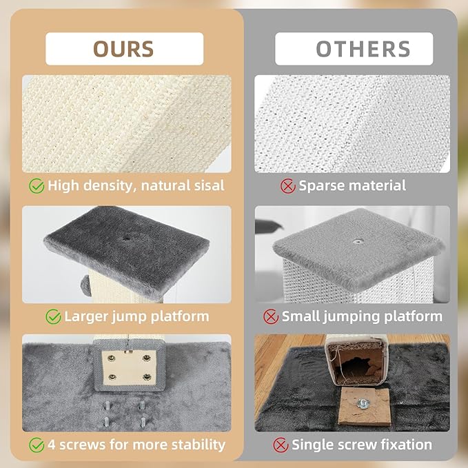 - Stable and Sturdy: The Cat Scratching post has a large-size base of 15.7*15.7 inches, making it more stable and less likely to tip over when your cat plays or scratches. The base has four screws and the post joints are reinforced so they won't break if the cat is very heavy