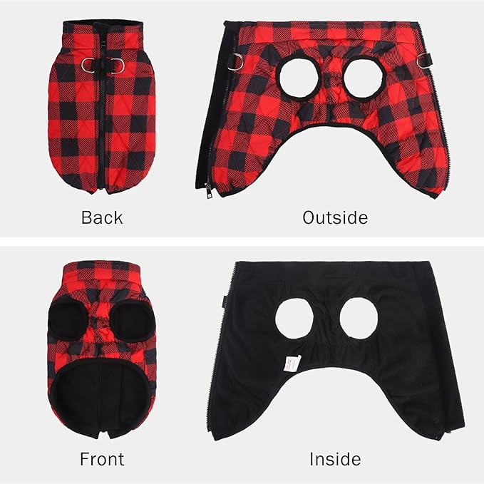 - STURDY D-RING: The D-ring on the back of the dog Polyester jacket is made of ultra-durable material giving this winter coat also the function of a chest harness. You can directly buckle the leash to go out to short walk your dog. It eliminates the tedious process before going out, and less wearing makes the dog more comfortable