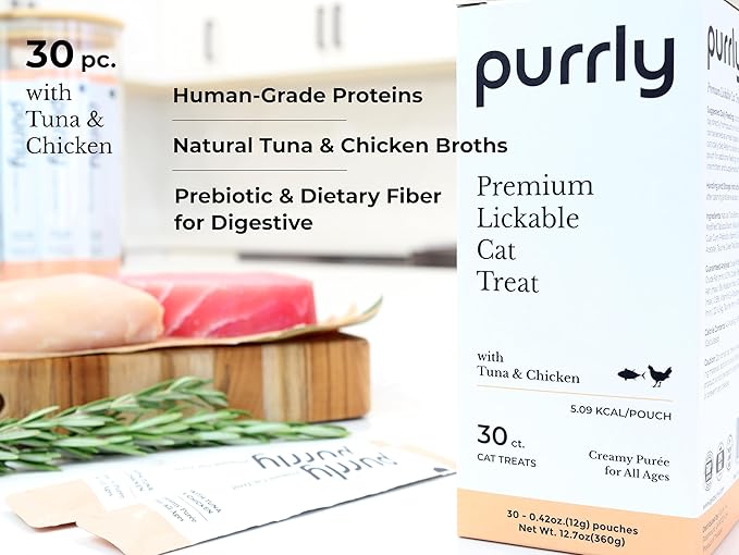 Purrly Cat Treat Topper Lickable Wet Squeezable Healthy Human-Grade Tuna & Chicken Breast with Prebiotic and Dietary Fiber for Indoor Cats (30 Count) Grain-Free Non-GMO No-Preservatives
