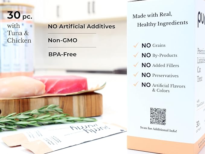 - INTERACTIVE & BONDING EXPERIENCE - Purrly's lickable puree encourages a unique and interactive way to treat and bond with your cat. You can offer the treat directly from pouch, your finger or a spoon, creating a moment of shared enjoyment and strengthening the connection between you and your feline friend. These treats can become an integral part of playtime, training sessions, or simply offering a small token of affection, fostering a deeper and more rewarding relationship with your cat.