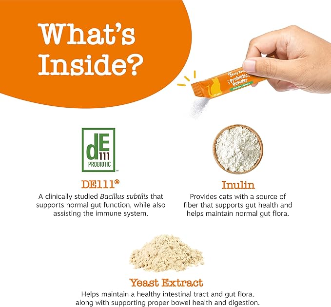 - Featuring DE111 Probiotics for Cats - This cat probiotic supplement contains DE111, which is a clinically studied Bacillus subtilis probiotic for cat digestive support and immune system function for cats.