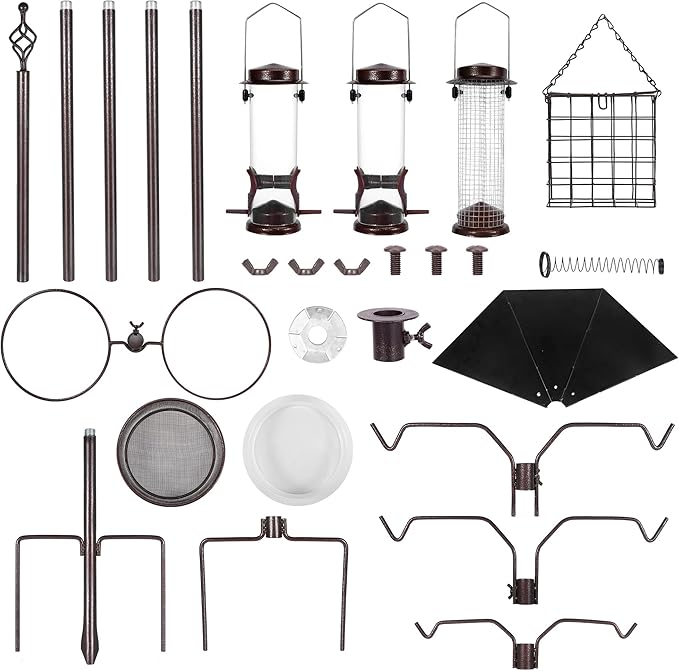 - Multi-purpose: Bird feeder pole comes with tube feeders, melon seed feeder with tube, suet feeder, 4-large top hooks, mesh tray, 2-middle hooks, water bath bowl, and 5-prong anchor, to provide sufficient resting and feeding places for birds.