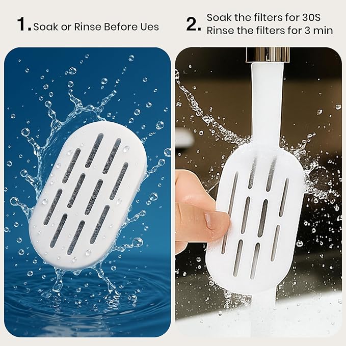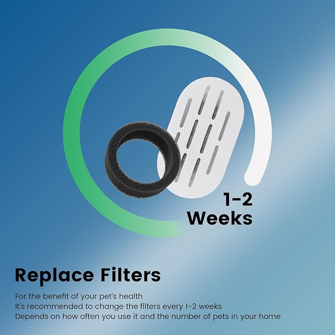 - Recommendations For Use - To prevent activated carbon dust (which will not harm your pet), soak the carbon filter in a separate bowl for 5 minutes and rinse for 30 seconds before using. Depending on how often your pet drinks and how many pets use the fountain, please change the carbon filter and sponge filter every 1-2 weeks and clean the cat fountain pump.