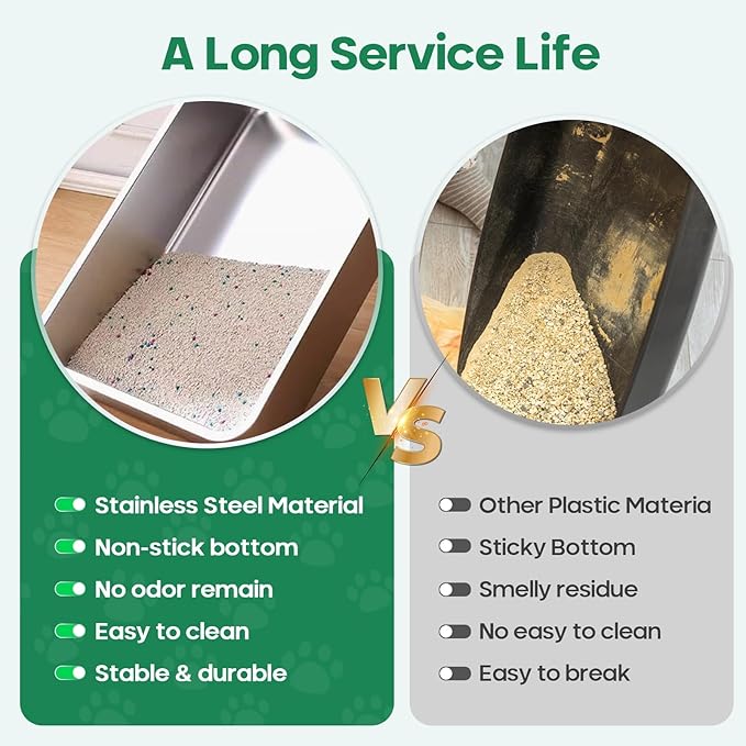 - 【Easy to Clean】: The smooth surface of our metal litter box prevents litter debris from sticking, allowing waste to naturally slide and accumulate at the bottom. This design facilitates quick and hassle-free cleaning, helping you maintain a tidy living space effortlessly.