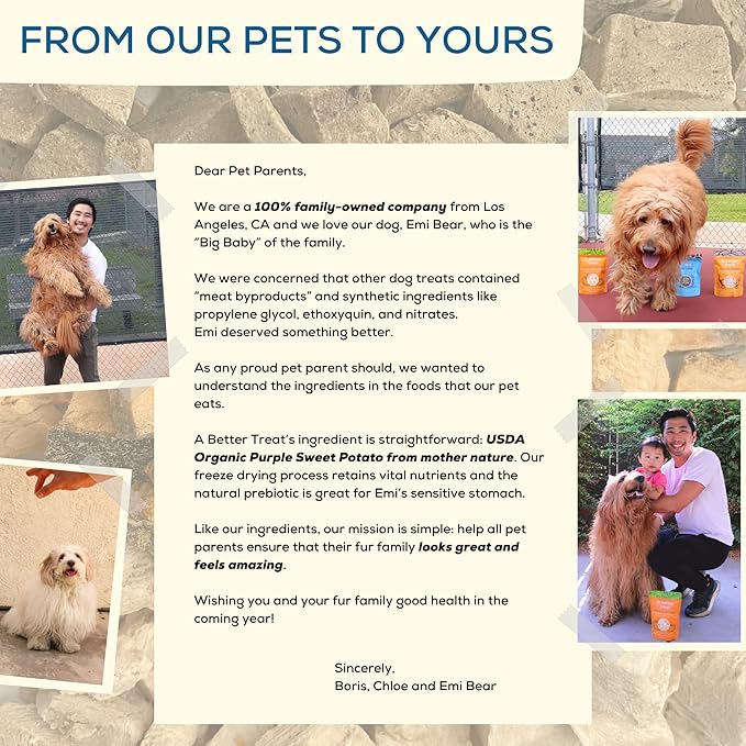- SUSTAINABLY SOURCED AND MADE IN THE USA: Our treats are sustainably sourced, organic, and human grade. They are made in the US at our organic certified facility to ensure human grade quality. Our mission is to ensure only the freshest, healthiest, and best quality ingredients to make A BETTER TREAT