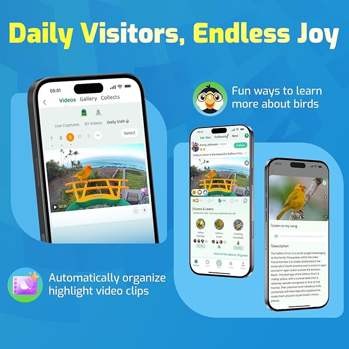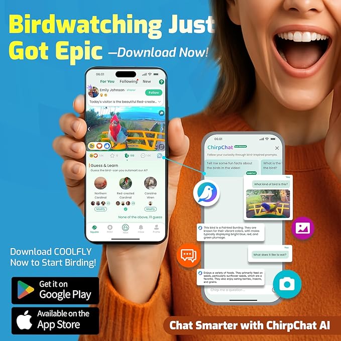 - World's First Backyard Birding App for Interaction and Entertainment: HIXX Smart Bird Feeder pairs seamlessly with CoolFly, the FIRST App designed for interactive birding. CoolFly combines FREE AI bird identification with vibrant community features like video share, likes, comments, and Group Chats. Dive into a rich bird database with detailed species traits, sounds, diet, and more. HIXX Bird Feeder and CoolFly redefine birdwatching - making it smarter, more interactive, and globally connected