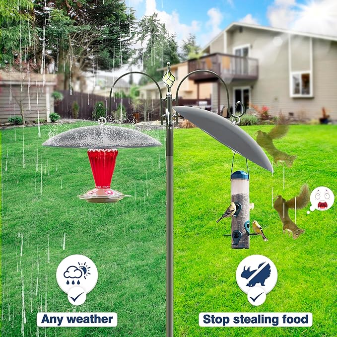 - 【13 Inch Dome Cover】Fits most hummingbird feeders, easy to install, just hang it on a shepherd's hook or tree trunk, the feeder will hang below the dome cover, which protects your precious bird food! The curved design effectively blocks rain and leaves from entering the inside of the bird feeder.