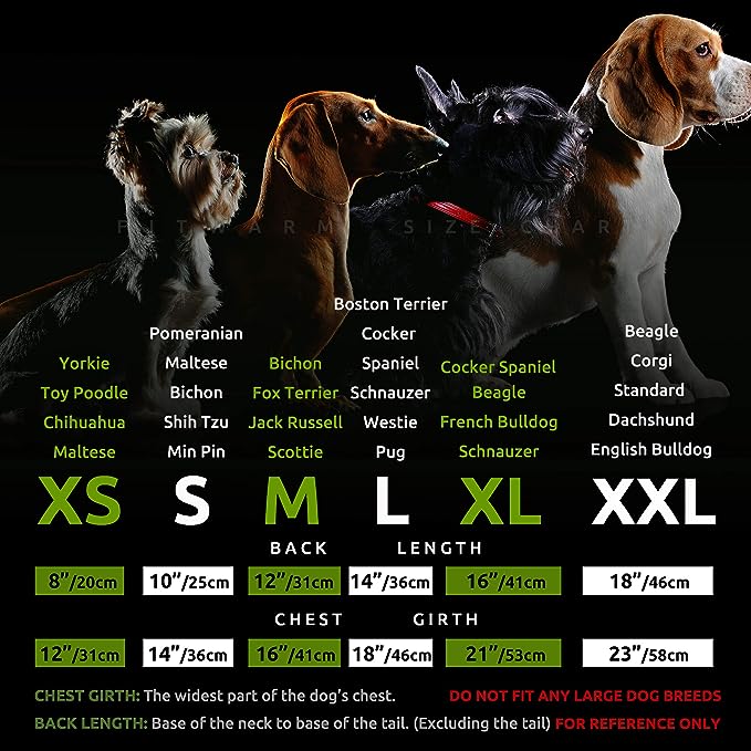- FOR SMALL DOG BREEDS. Please priority follows the chest size. Size Medium, fits 12" back, 16" chest. Recommended for: Bichon Frise, Shih Tzu, Havanese, Fox Terrier, Jack Russell, Scottie, Pug, Poodle, Miniature Dachshund, Italian Greyhound, Westie, Boston Terrier, Maltipoo and Cavalier King Charles Spaniel.