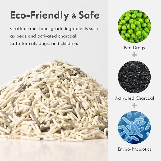 - NATURAL FOOD-GRADE INGREDIENTS: Crafted from premium pea fiber and starch, our litter is an embodiment of our commitment to your pet's well-being and the environment. Trust in a cat litter made entirely from natural ingredients.